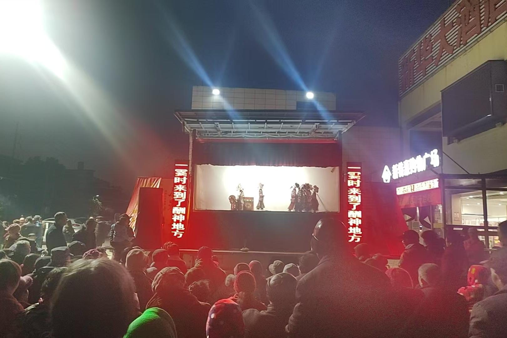 1月10日晚,天门市群众艺术馆联合佛子山镇文明实践所、天门市皮影戏艺术家协会,在佛子山镇政府广场及新华大酒店广场举办“佛子山间光影戏·非遗皮影醉乡人”新年惠民演出活动。经典古装渔鼓皮影戏《父女会》首演吸引众多群众驻足观赏,现场喝彩声不断,千年非遗在冬日乡村焕发新活力。
